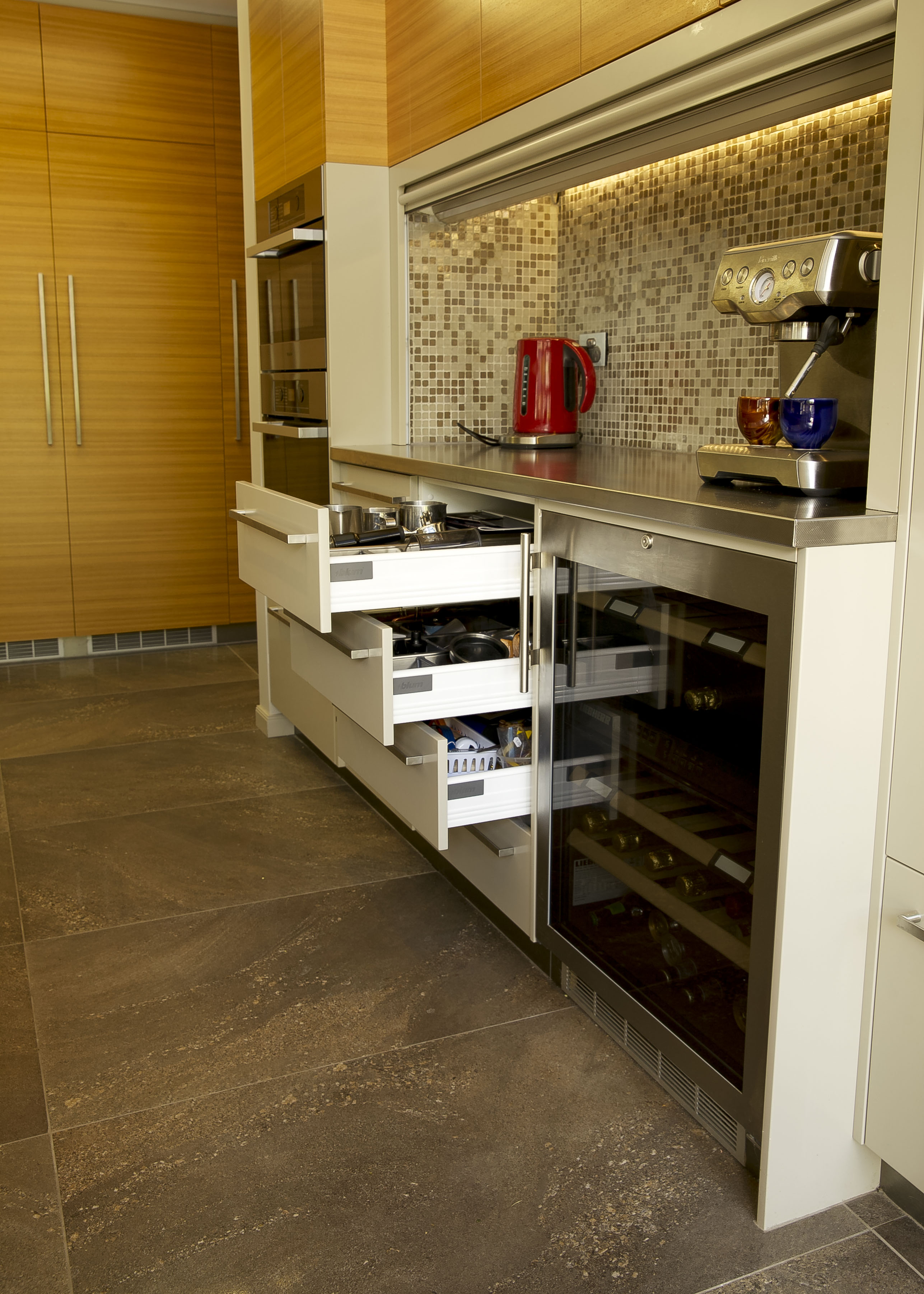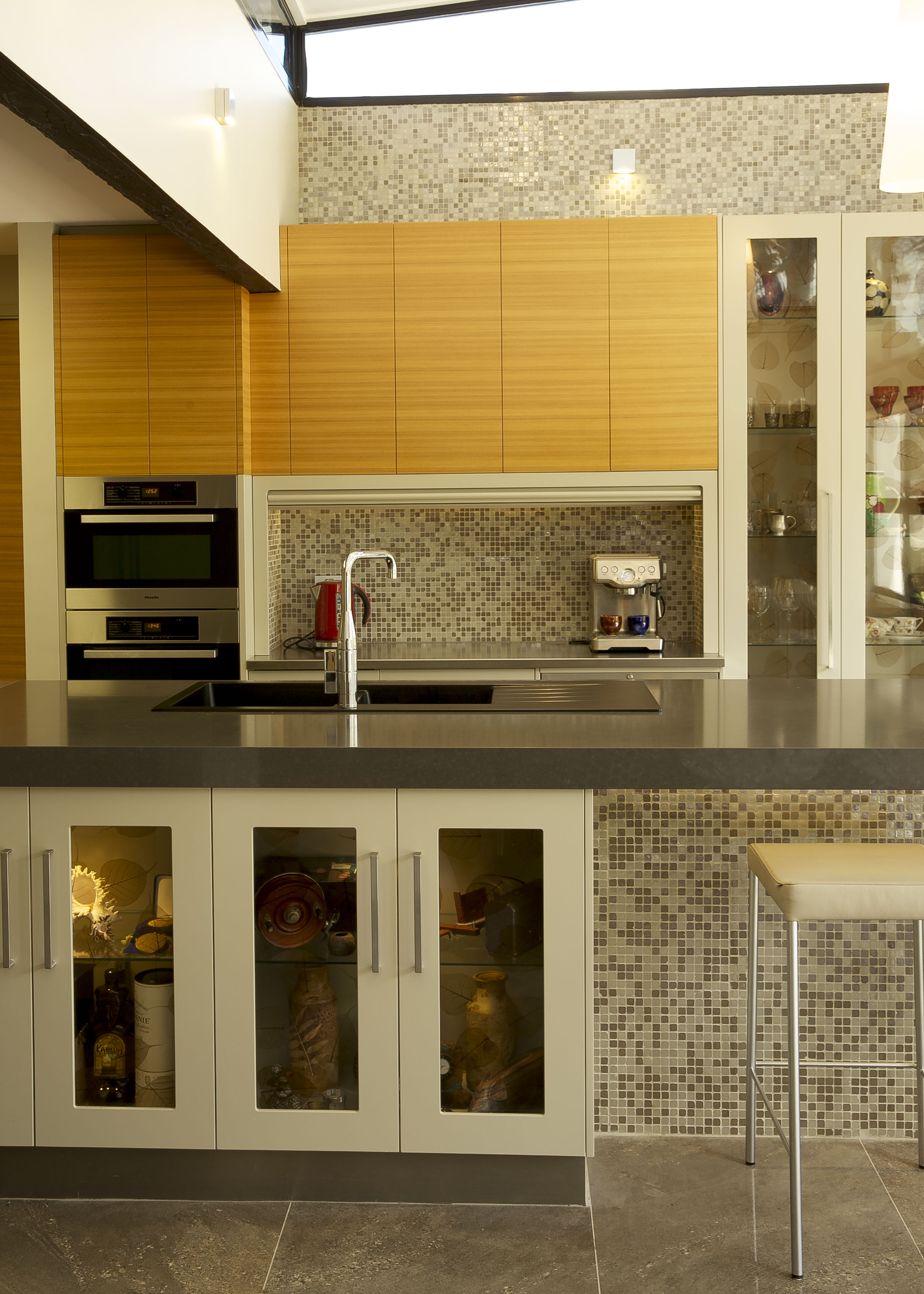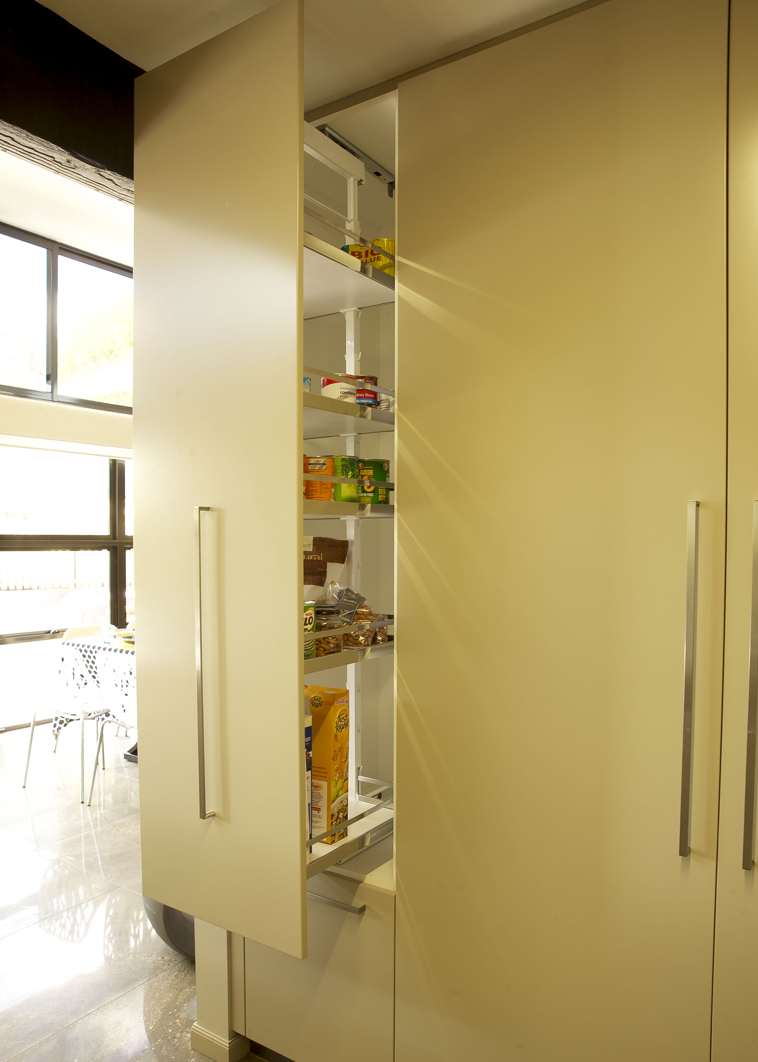 The design of the new kitchen boasts itself of enormous amounts of storage. Every item has been carefully thought about and designed around so that nothing is left without a home. Huge pantry space allows for the everyday items to be in close range as well as bulk storage items. Kitchen appliances such as the coffee machine and toaster are easily accessible within their own cupboard. The use of a Tambor door in this area allows it to be closed off should these items want to be kept out of sight. Display items of fine crystal and glass have been made into a show piece. Displayed behind beautifully crafted inlaid Lucere doors they create a real homeliness to the space.