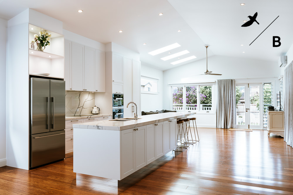 Our clients have a love of a delicate style called French Provincial. We were engaged to design their kitchen which was to be situated within a new extension wing off their existing home. We wanted to locate the kitchen within the middle of the space so that it would provide an informal and formal lounge and dining area on either side.