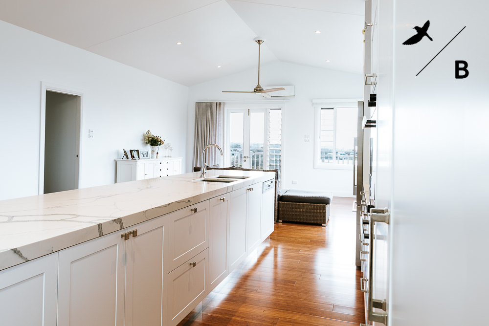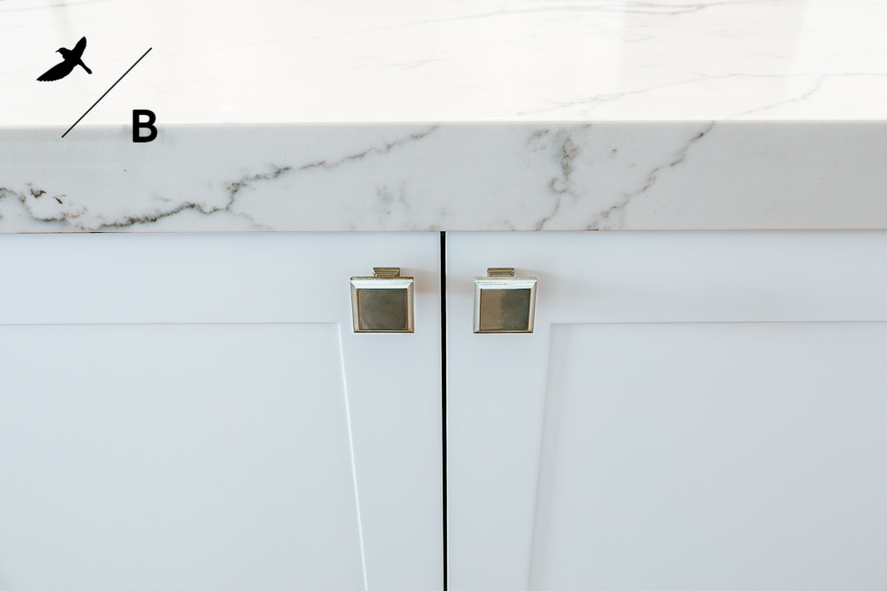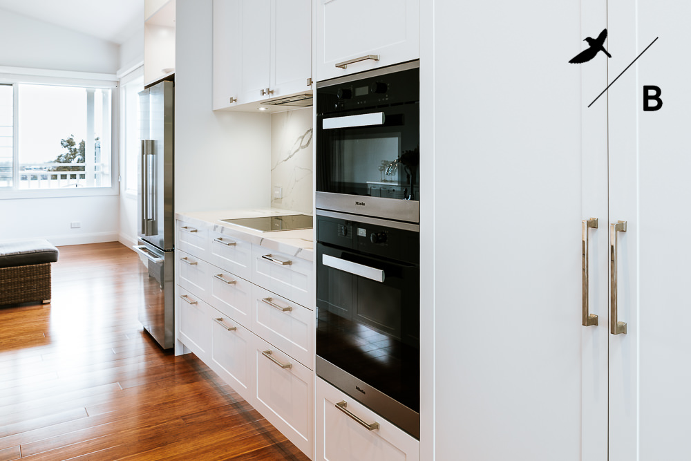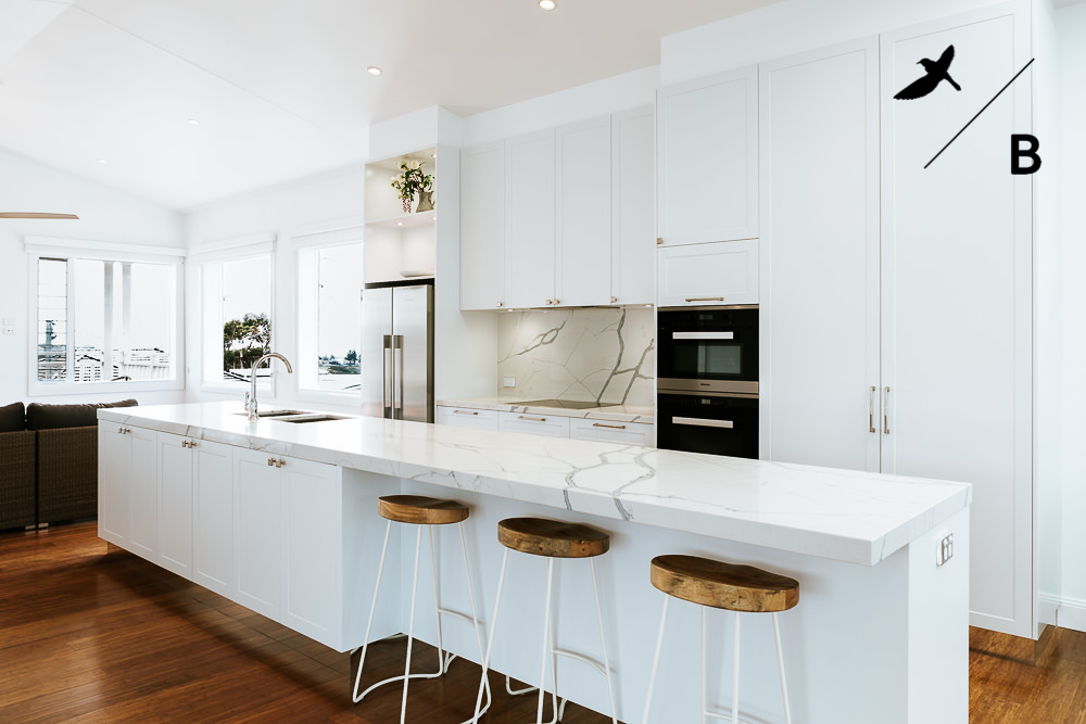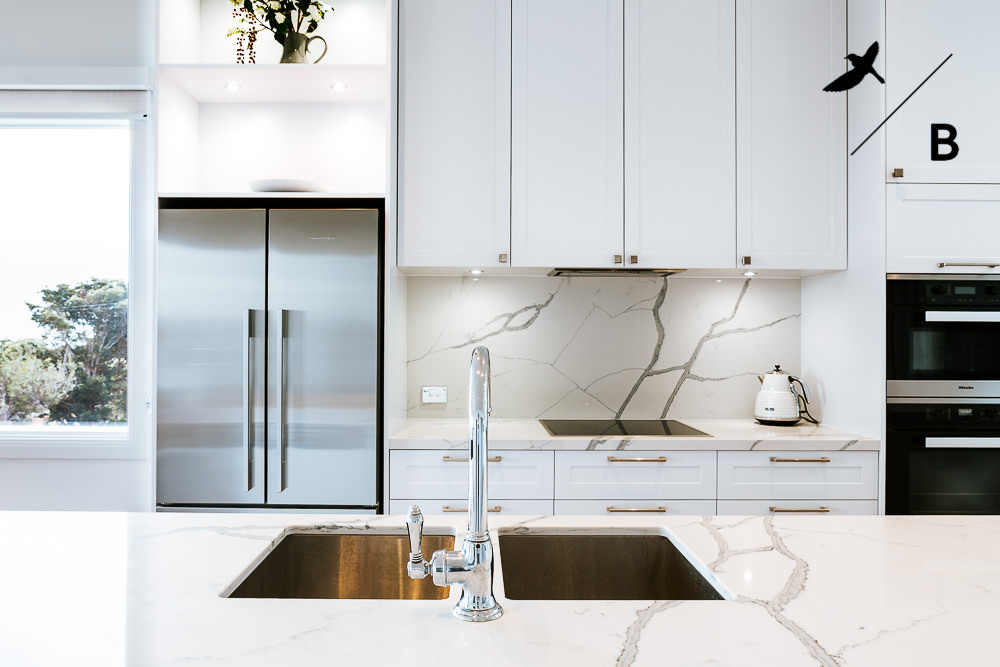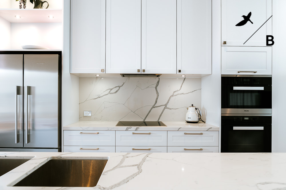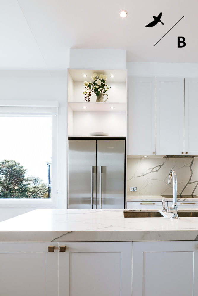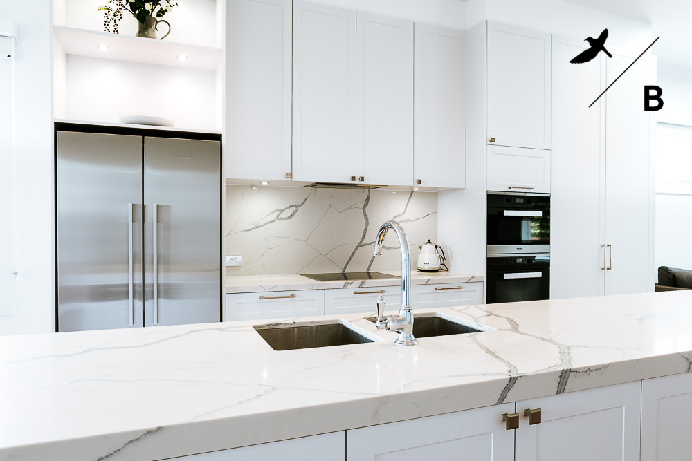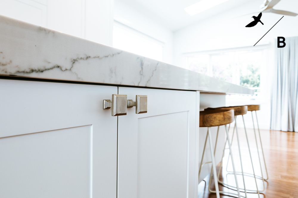 We wanted to refine our selections by using only a crisp white for the cabinetry keeping it light and expansive. Finer details like the shaker profile doors and beautifully designed handles and knobs adorning each cupboard and drawer front help layer the kitchen with elegant sophistication. The simplicity of the white allows for the striking benchtop and splashback to draw the necessary attention needed in a kitchen this size.