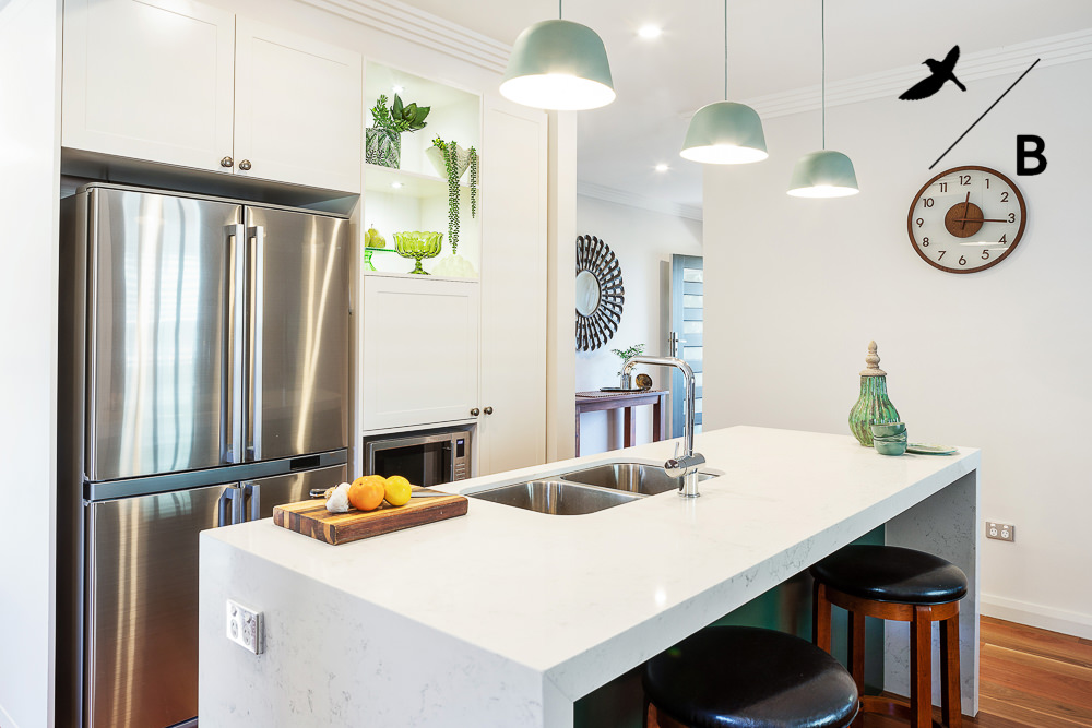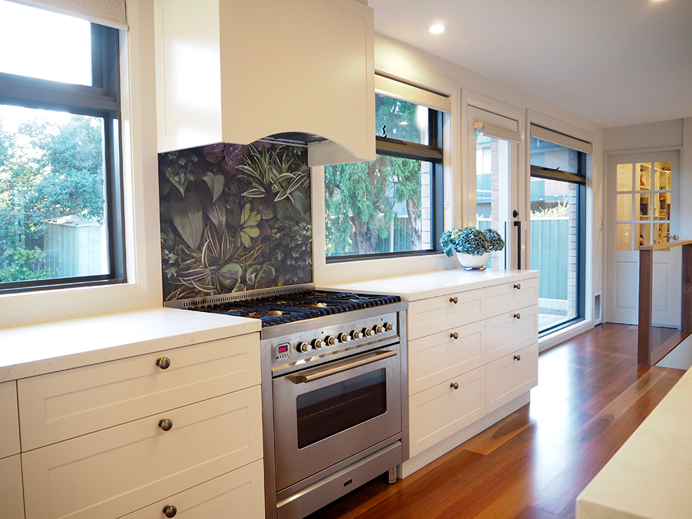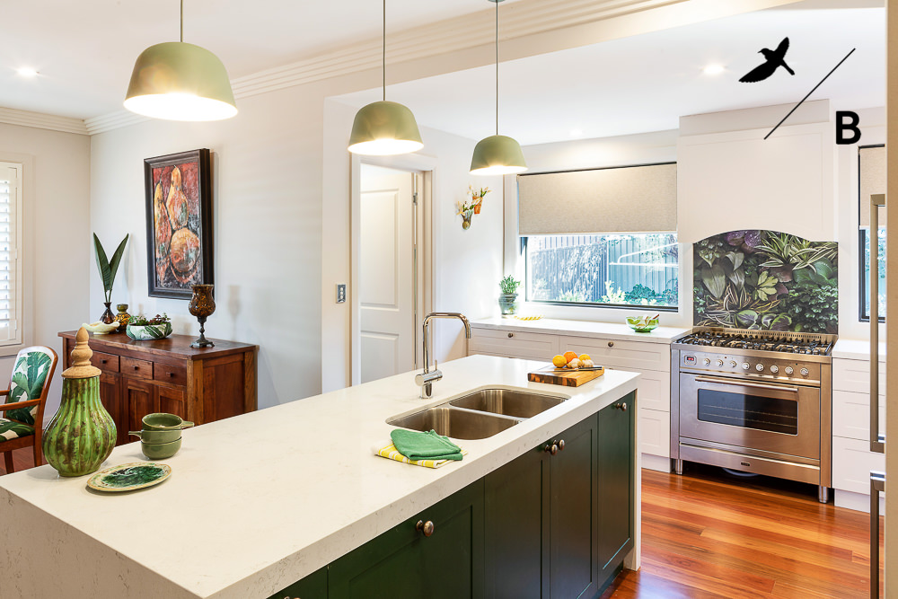 Green is a feature colour throughout the new home, the Kitchen features a fabulous jungle inspired tile on the back of the island bench and cook-top splashback.