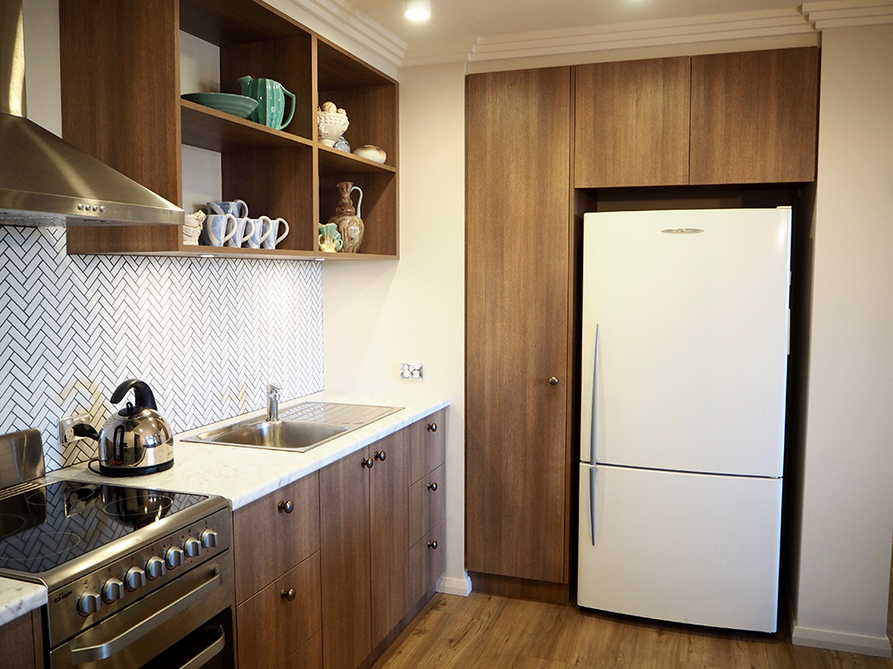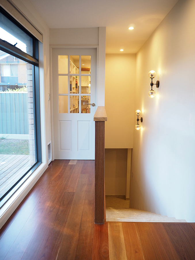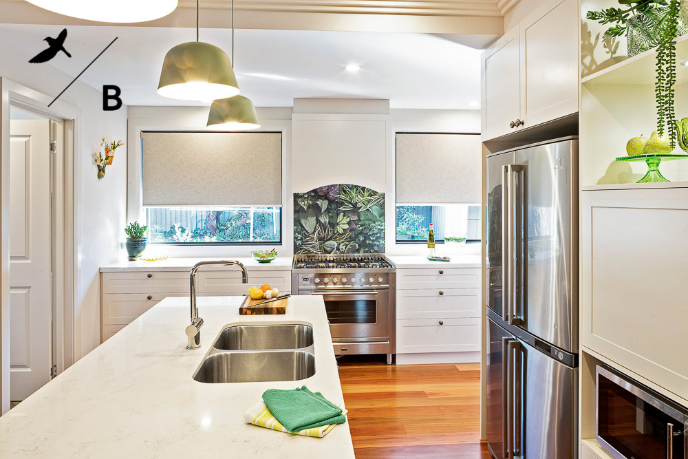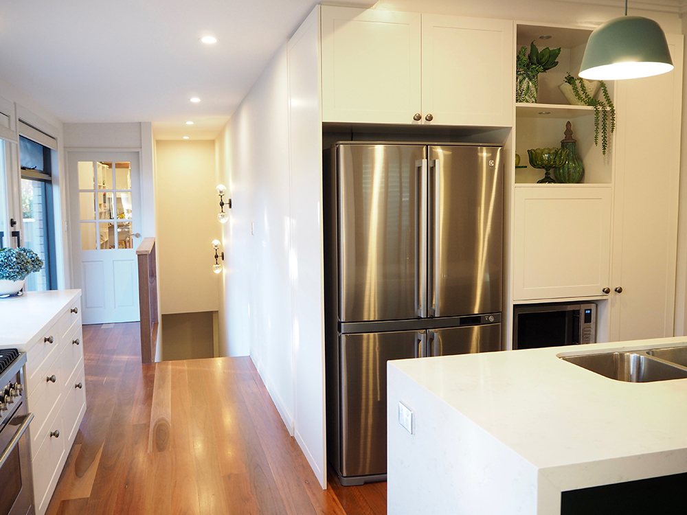 New grey ironbark timber floors were installed upstairs and we opted for a shaker profile to the kitchen joinery in a gorgeous satin white finish. The benchtops are Smartstone Amara which provides a beautifully soft marble look. The old kitchen was situated in the middle of the house, away from any external walls. Birdblack Design made creative use of an old sunroom, extending the kitchen into this space. Once new windows and doors were installed, natural light now abounds in this brilliant space.